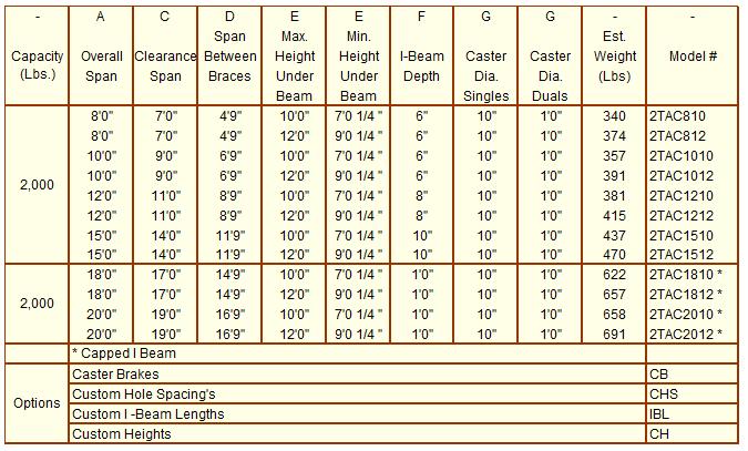 • 2,000 lb. cap. 5 single casters per base 480 lb cap per tire (Span between wheels = Overall span minus 11 1/2″)