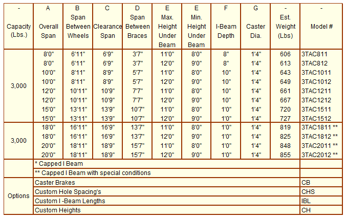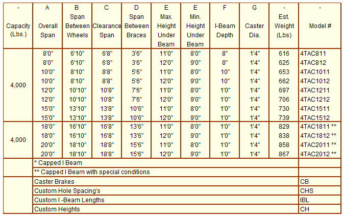 • 1,000 lb. cap. 4 single casters per base 480 lb cap per tire (Span between wheels = Overall span minus 11 1/2″)